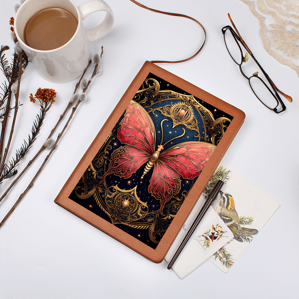 This sophisticated vegan leather journal features a rose‑pink and antique gold butterfly with filigree wings, framed by swirling ornamental florals. Its rich colors and baroque details make it feel like a piece of wearable art for your desk or altar. Perfect for gratitude journaling, love letters, and self‑care intentions.